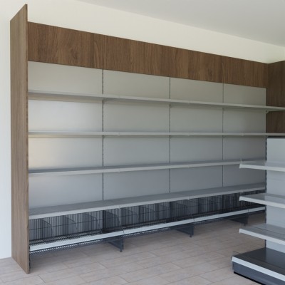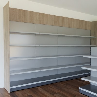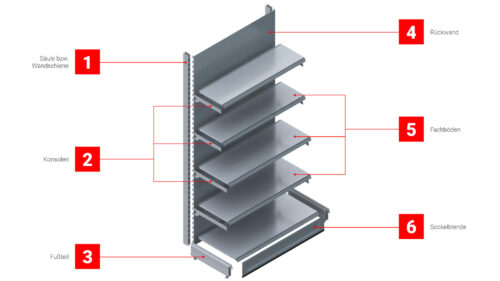 Jedes Ladenregal besteht im Wesentlichen aus Säulen, Fussteilen, Rückwänden, Sockelblenden und Fachböden.