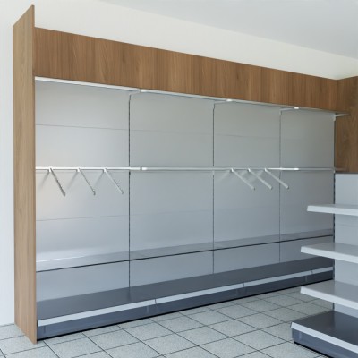 Das Regal ist speziell für die Präsentation von Textilwaren vorgesehen. Verschiedene Konfektionsrahmen und Tragschienen ermöglichen eine Benutzung für alle Kleidungstypen.